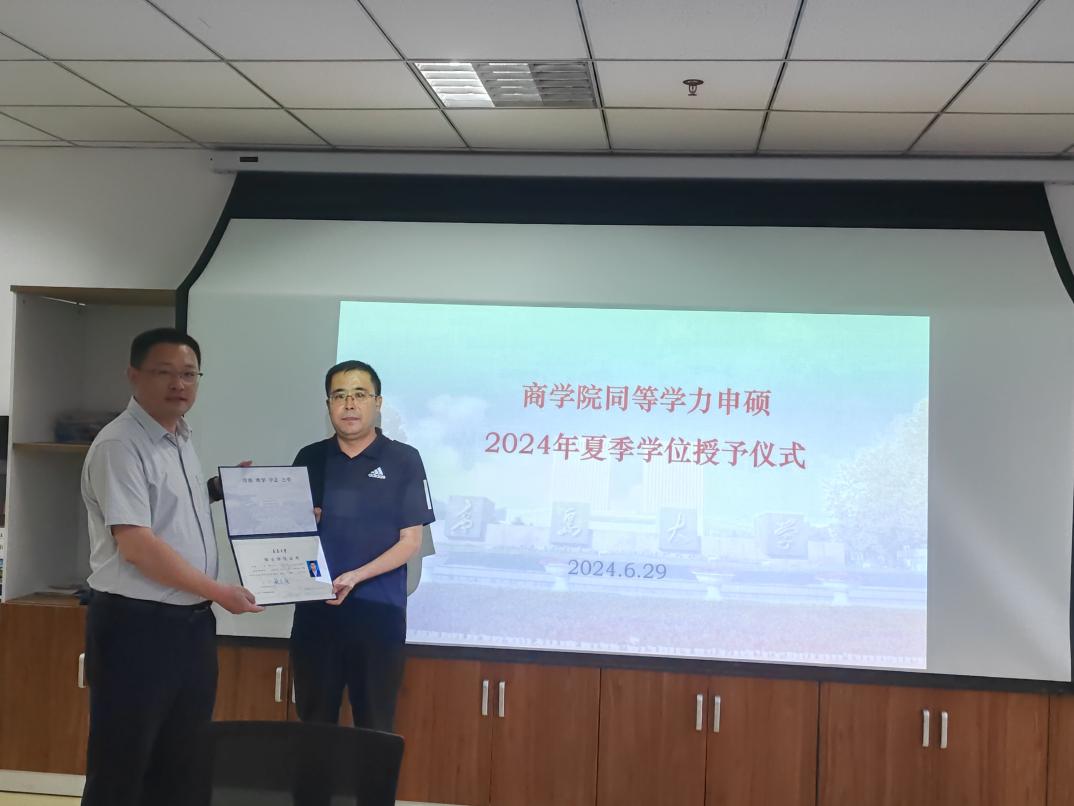开题结束后,张磊副院长为今年通过硕士硕士论文答辩符合学位授予条件的2019级会计学专业王万里同学颁发了硕士学位证书。