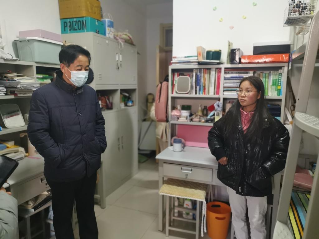 在走访过程中,王功勇与同学们亲切交谈,详细询问了学生居家学习生活情况、返校途中情况和返校后的学习安排,提醒同学们在此特殊时期要严格遵守学校疫情防控的相关规定,积极调整状态,健康作息,勤加锻炼,增强免疫能力。他还特别强调要注意防诈骗和宿舍安全问题,鼓励同学们放心在校、安心学习、舒心生活,科学抗疫,坚定信心,学院将一如既往地努力为同学们做好服务、提供帮助。