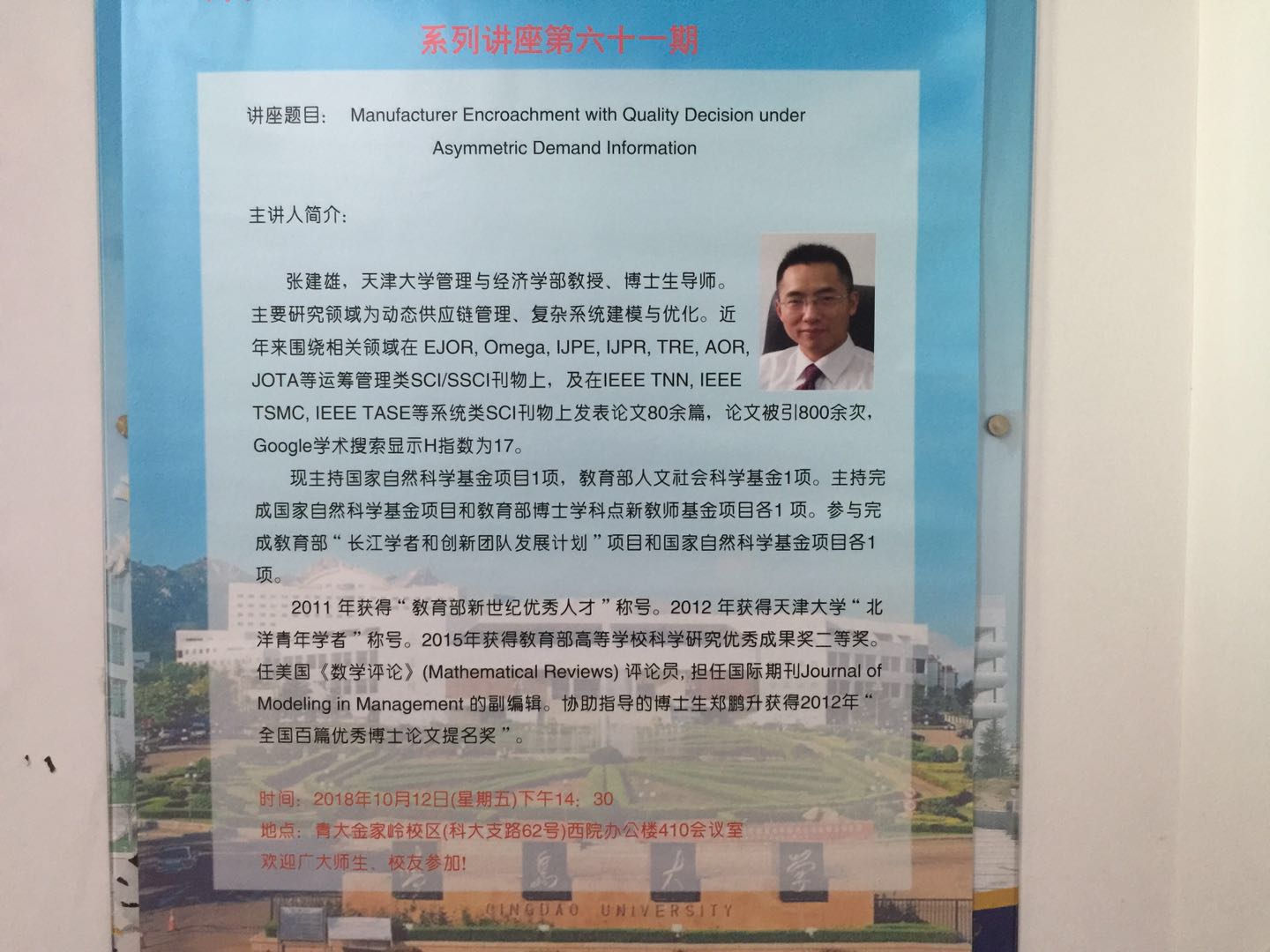 10月12日下午,BB贝博艾弗森官方网站周五学术之夜第六十一期,邀请了天津大学张建雄教授来我院讲座,报告题目为 “Manufacturer encroachment with quality decision under asymmetric demand information”。BB贝博艾弗森官方网站院长胡劲松主持报告会,管理科学与工程系主任王磊教授、管理科学与工程系教师、研究生聆听了报告。