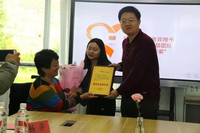 同沐阳光残疾人辅助就业中心主任杨萍和陈崇研共同为“BB贝博艾弗森官方网站社会工作专业实践基地”的揭牌。杨萍女士介绍了同沐阳光社会工作站相关情况,希望能够与BB贝博艾弗森官方网站大爱无声项目再次合作,建立起长期有效的合作机制。杨萍女士授予“大爱无声”公益团队“最佳社会责任奖”奖牌。