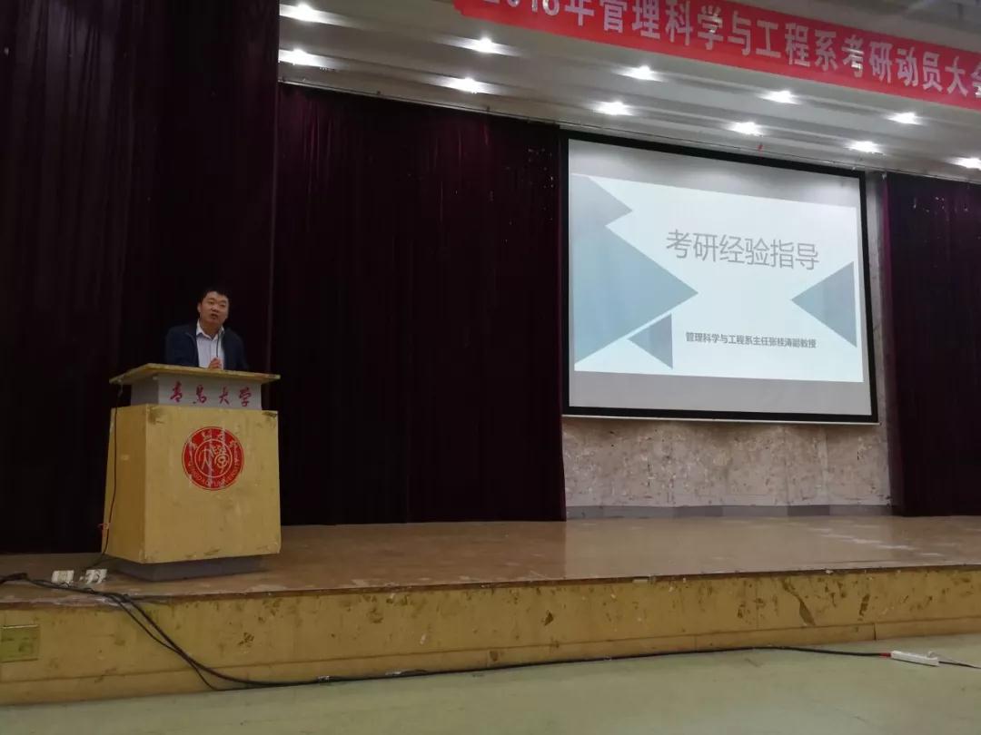 417日晚6302018年管理科学与工程系考研动员大会暨考研交流会于图文中心四楼成功举行。莅临本次大会的嘉宾为管理科学与工程系主任王磊教授,管理科学与工程系副主任张桂涛副教授,管理科学与工程系副主任孙浩副教授,管理科学与工程系团总支书记陈倩倩老师,2015级管理科学与工程系辅导员赵业婷老师,管理科学与工程系吕途老师。