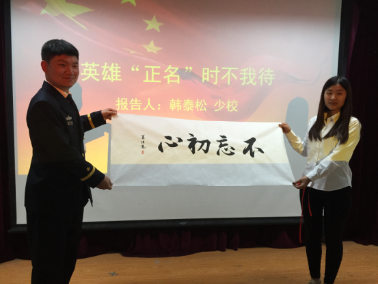 学院大学生德育导师、中国人民解放军92212部队干部科韩泰松少校为学生做了“英雄正名,时不我待”的精彩报告,并向入党积极分子提出两项行动要求:从英雄魂上净化灵魂,书写忠诚;从英雄气上凝聚力量,练就本领。韩少校还结合自身经历分别回答了同学们关心的问题。