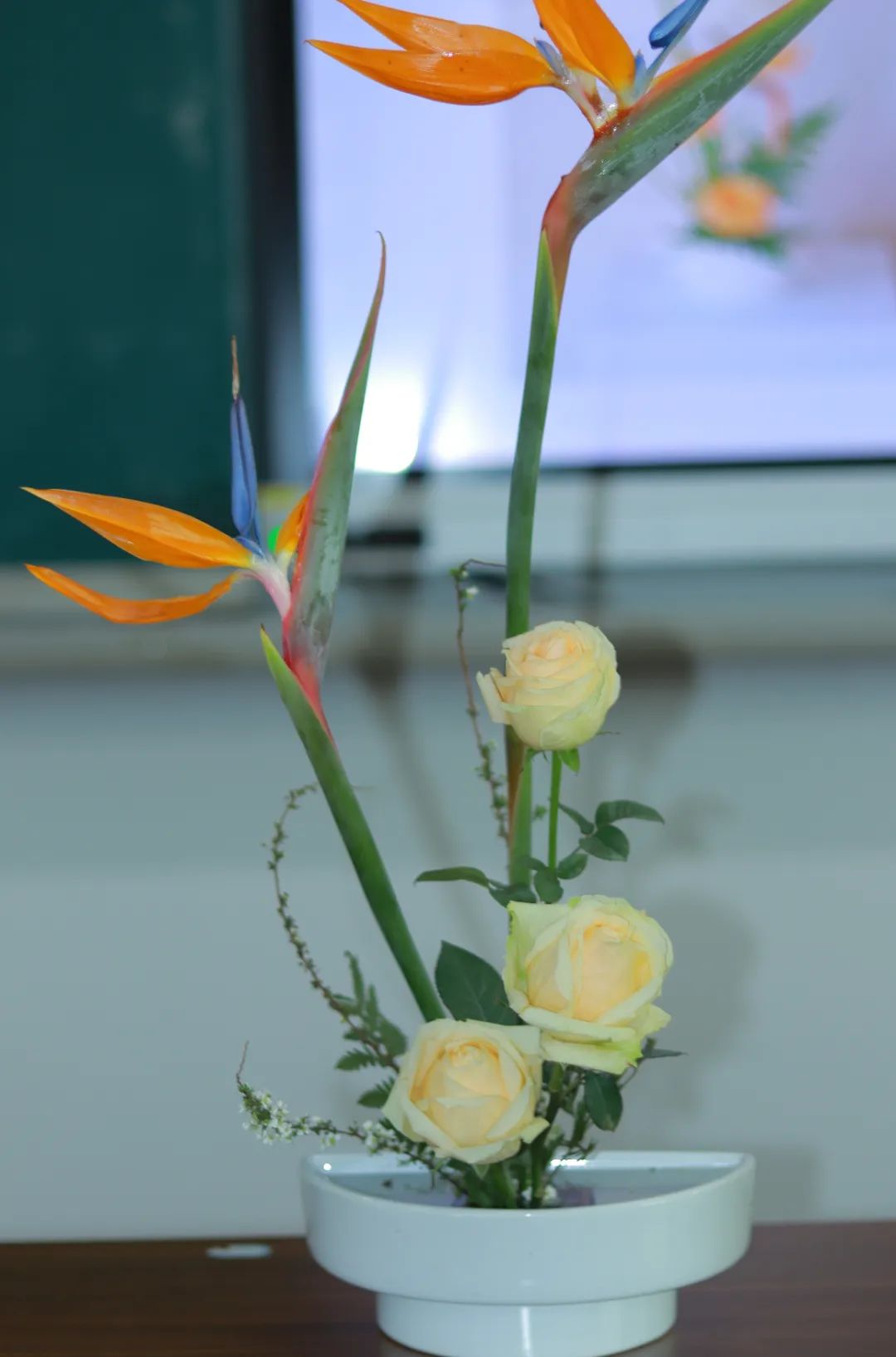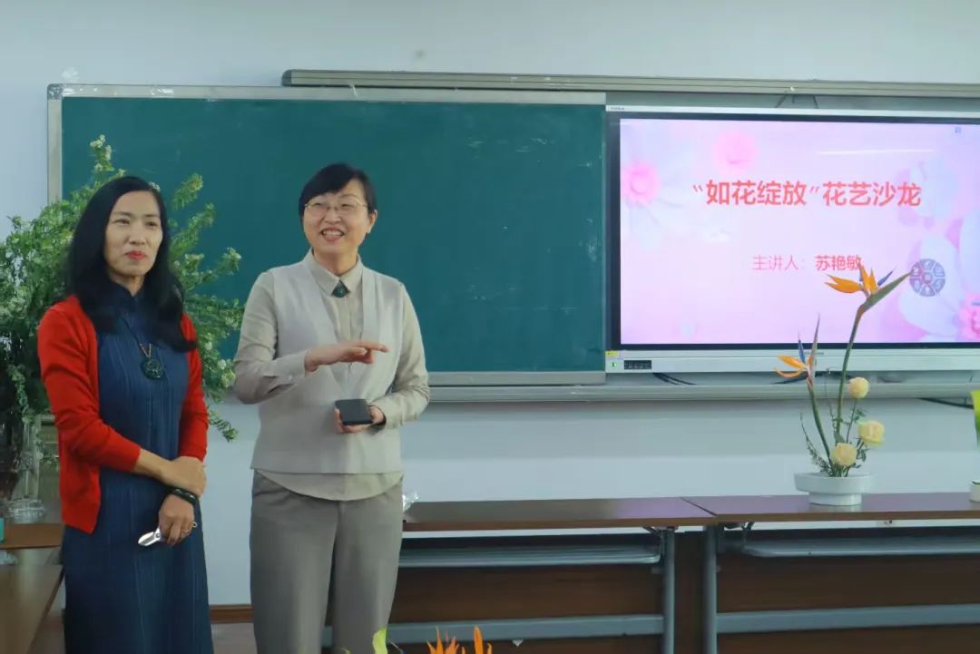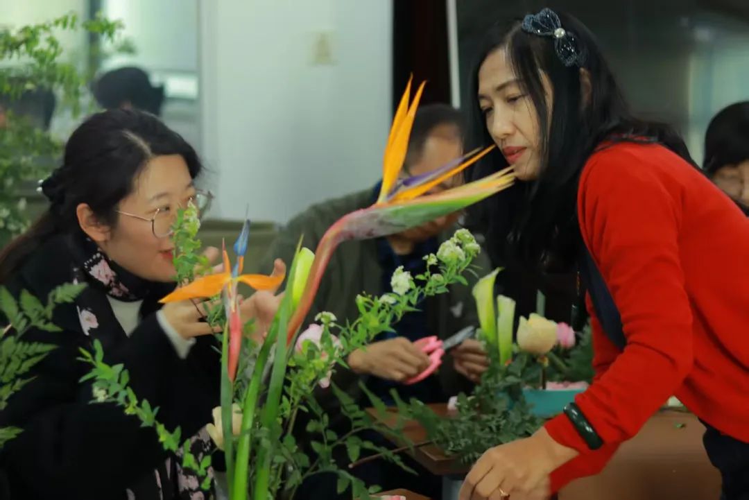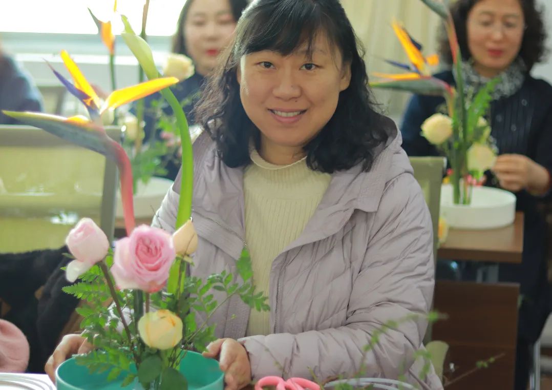 花艺沙龙由分工会主席尼梅颉主持,邀请苏艳敏老师进行现场指导。苏老师从花卉品种选择、色彩搭配技巧、花枝修剪手法到造型设计理念展开讲解,现场示范“高低错落”“虚实相生”的构图技巧。老师们以花为笔,将不同花材巧妙搭配,勾勒出春意盎然的画卷。活动现场花香四溢,笑语盈盈。“插花是修身养性的艺术,让我在忙碌中感受到宁静的力量。”一位青年教师捧着自己的作品感叹道。