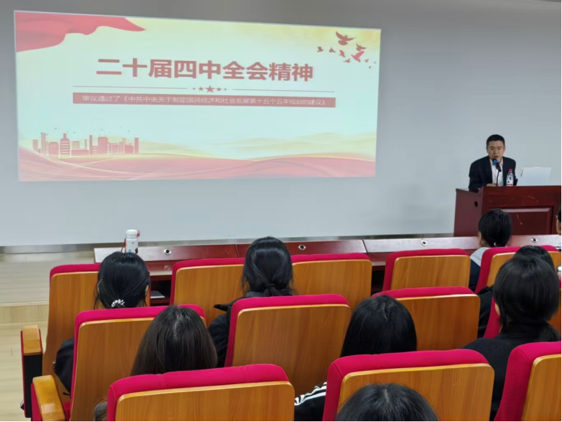 党课伊始,王庆金书记指出党的二十届四中全会是在我国即将胜利完成“十四五”主要目标任务,进入基本实现社会主义现代化夯实基础、全面发力的关键时期召开的一次重要会议。他详细介绍了全会的基本情况,重点围绕“十五五”时期经济社会发展的六个“坚持”展开论述,同时结合十八大以来历届四中全会的核心议题,帮助学生党员理清历史脉络,从而深刻认识到党的二十届四中全会在基本实现社会主义现代化进程中的承前启后的历史地位。