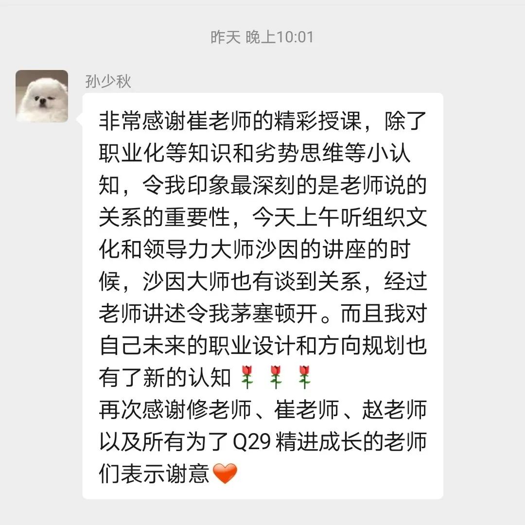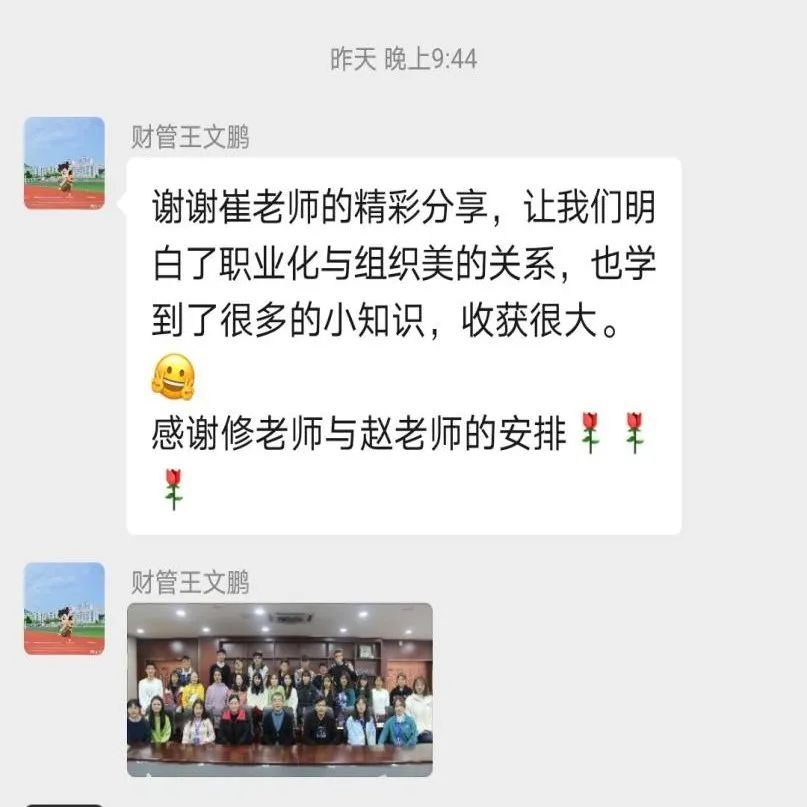 崔老师与同学们进行了问答交流,发散问题,扩展视野,同学们在为人处世和职业化问题上有了更加深刻的认识,收获良多,受益匪浅。