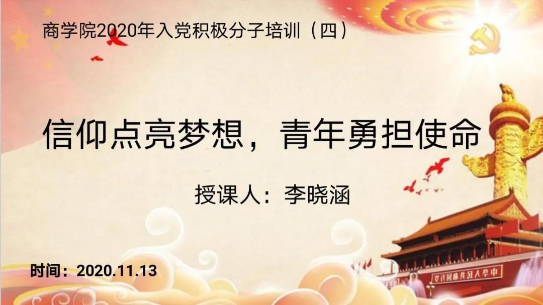 2020年11月13日下午三时,BB贝博艾弗森官方网站入党积极分子培训班第四讲在BB贝博艾弗森官方网站金家岭校区图文报告厅开展,会计学系本科党支部书记李晓涵老师授课“信仰点亮梦想,青年勇担使命”。