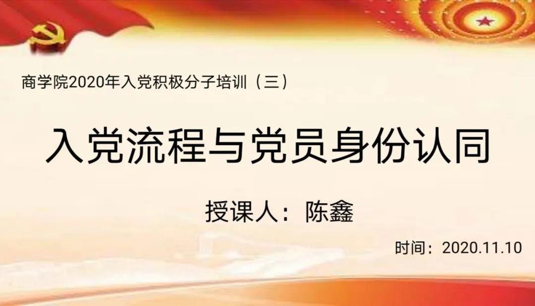 2020年11月10日下午三时,BB贝博艾弗森官方网站入党积极分子培训班第三讲在BB贝博艾弗森官方网站金家岭校区图文报告厅开展,BB贝博艾弗森官方网站会计学系团总支书记,会计学系本科党支部书记陈鑫老师授课“入党流程与党员身份认同”。