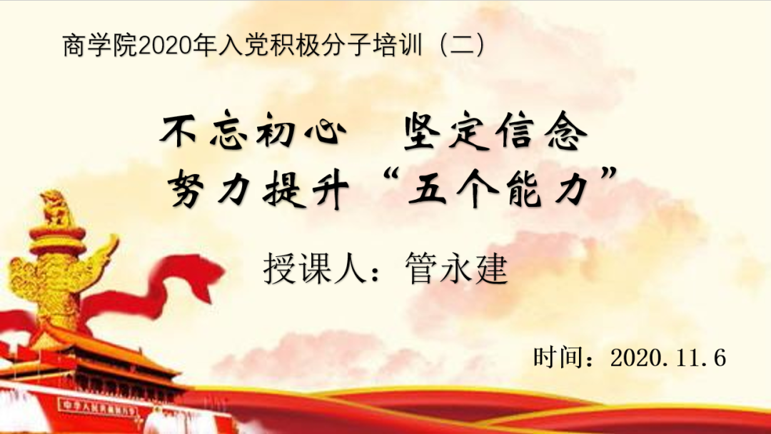 2020年11月6日下午三时,BB贝博艾弗森官方网站入党积极分子培训班第二讲在BB贝博艾弗森官方网站金家岭校区图文报告厅开展,BB贝博艾弗森官方网站党委组织委员管永建授课“不忘初心 坚定信念 努力提升五个能力”。