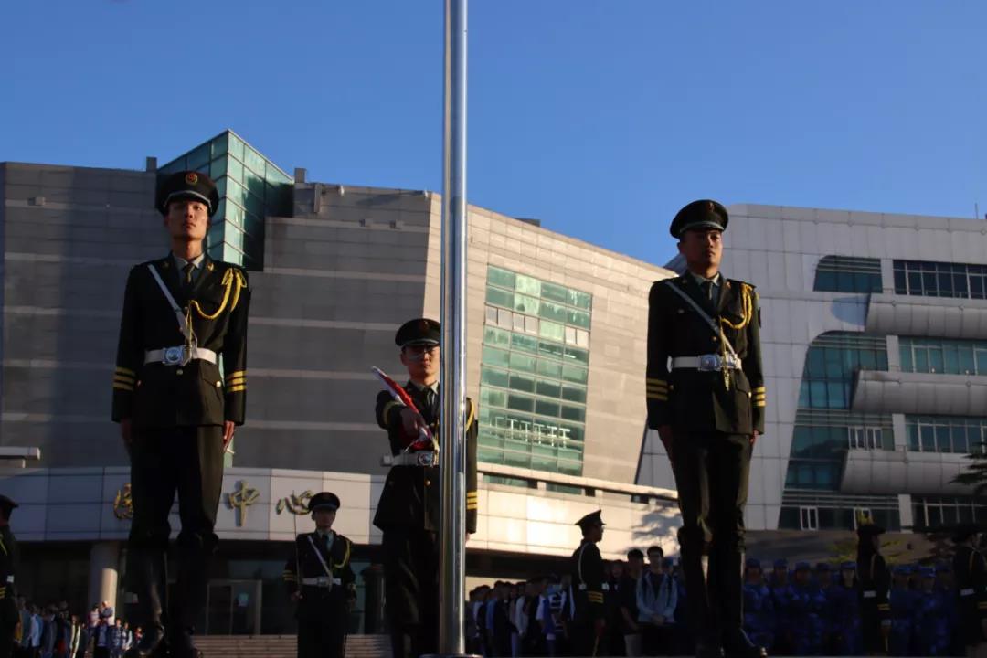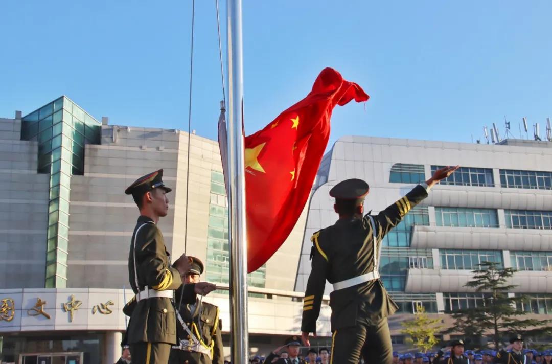红日初升,其道大光,伴随着一声口令下达,国旗班成员迈着铿锵有力的步伐,护送着国旗走向升旗台。迎着东方初升的的朝阳,五星红旗在庄严雄壮的国歌声中冉冉升起,随风飘扬。那抹从旭日上采下的红,在蔚蓝的天空下,给予所有中华儿女无限的自豪与骄傲。