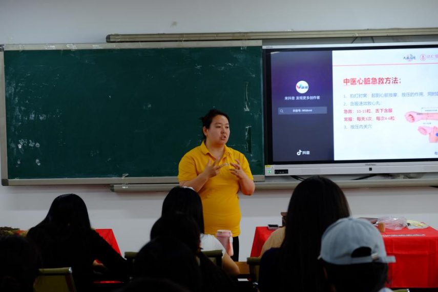 活动邀请天津医药集团金牌企业文化大使、天津市青年岗位能手张瑶老师以“端午时节防暑热,草药提神护安康”为主题,结合《黄帝内经》夏季养生理念,详解艾叶、薄荷、佩兰等端午特色药材的提神醒脑功效,并针对高温易发的头晕倦怠、湿热困乏等症状,教授师生科学配伍香囊的实用技巧。“原来端午挂艾草不仅是习俗,更是古人防病养生的‘天然方案’!”在场学生纷纷表示收获颇丰。