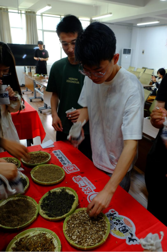 提神药材展:活动现场特设“端午药香”主题展区,紫苏、千里香等具有提神功效的道地药材依次陈列。师生通过触摸叶片纹理、品鉴药香气息,直观感知“芳香化浊,醒脾开窍”的中医理论精髓。