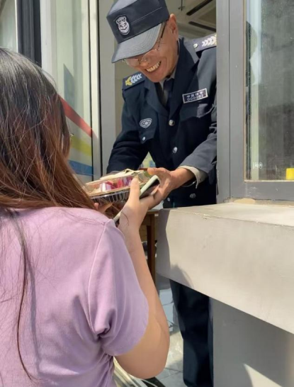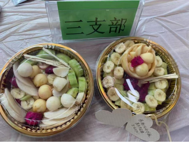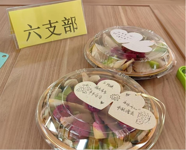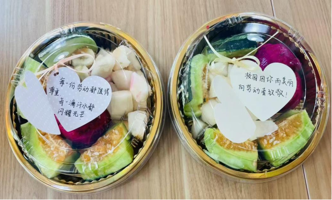 制作完成后,各小组派代表将果盘送至后勤岗位,收到礼物的工作人员纷纷表示“很惊喜很感动,非常感谢同学们的关怀”。