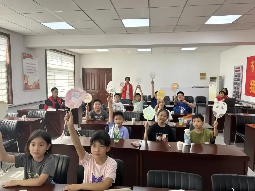 “古代的团扇不仅能纳凉,扇面上的花鸟山水还藏着文人的心意呢!”志愿者用动画短片讲述团扇从战国到明清的发展历史,带领孩子们赏析经典扇面画作。到了实践环节,孩子们纷纷拿起画笔,有人复刻传统花鸟图案,有人大胆创新,将卡通形象与水墨风格结合,让古老团扇焕发现代活力。完成创作后,孩子们主动分享设计思路,对“团圆”“友善”的文化寓意有了更真切的理解。