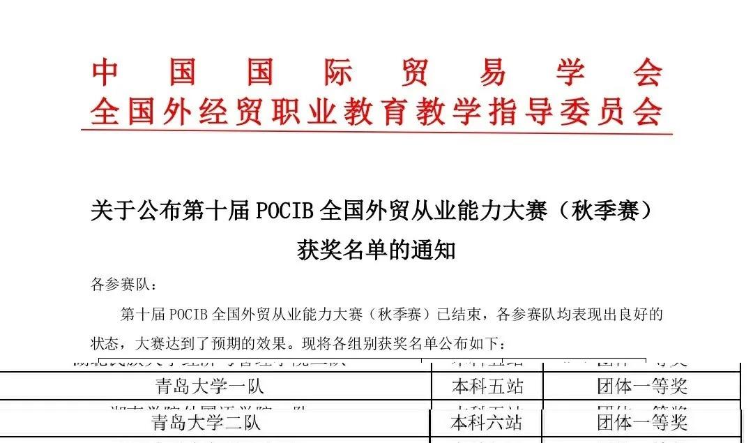 BB贝博艾弗森官方网站国际商务系二十位同学组成的两个团队在第十届POCIB全国外贸从业能力大赛中荣获两项团体国家一等奖,1项个人国家一等奖、5项个人国家二等奖、9项个人国家三等奖。