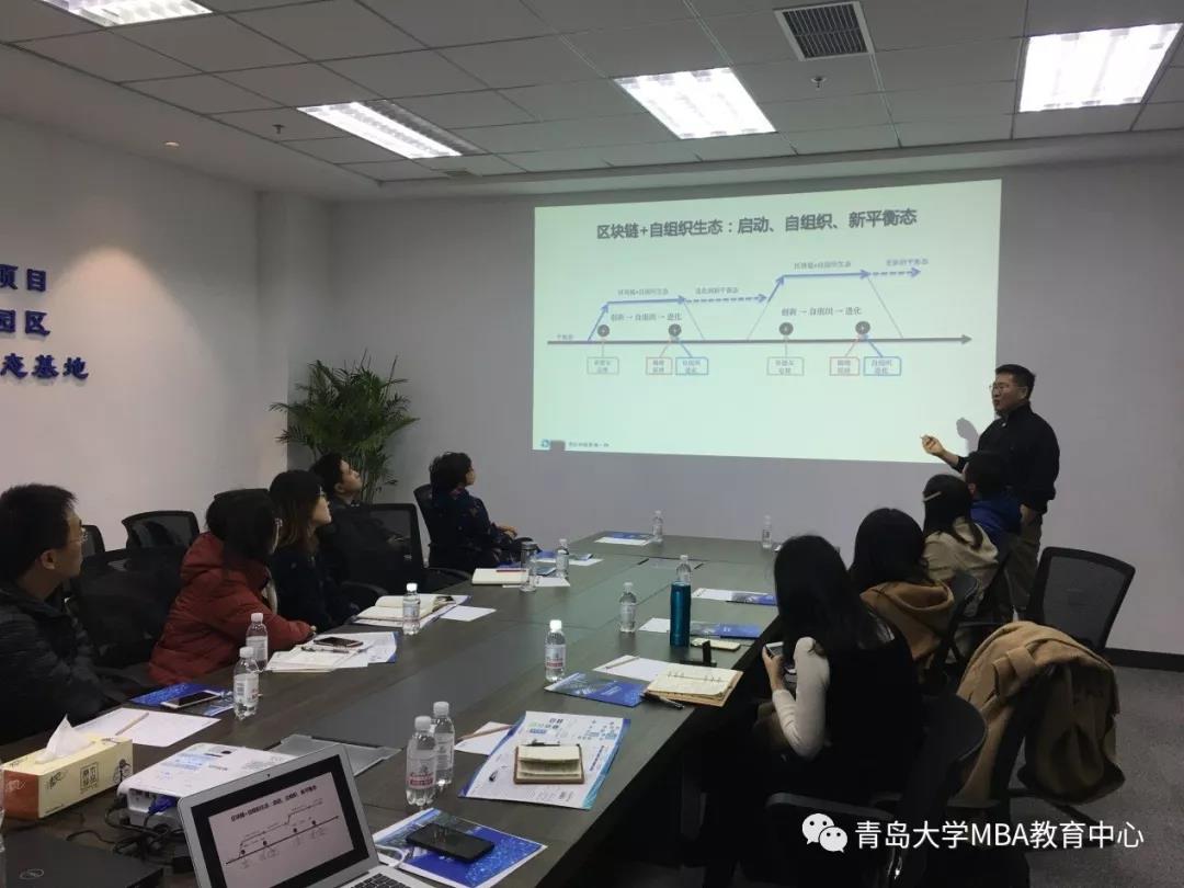 2018年 12月1日上午9:00,2018年 12月1日上午9:00,BB贝博艾弗森官方网站MBA学员到青岛链湾研究院参观学习。一开始,青岛链湾研究院闫昶德执行院长详细介绍了链湾成立的背景、发展历程和未来方向。他表示,青岛链湾以自我创新为动力,以区块链技术应用服务为导向,以“政府引导、市场推进、企业化运作”为原则,全面建设以“一楼、一中心、一院、五大平台、十大应用场景”为核心的区块链产业生态服务基地——“中国链湾”。