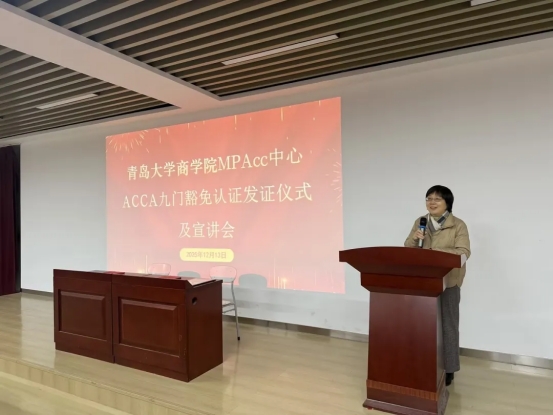 活动由BB贝博艾弗森官方网站原副院长、MPAcc项目主任周咏梅主持,BB贝博艾弗森官方网站副院长张磊,ACCA山东区负责人胡景皓,ACCA山东区教育发展主任闫卫华,BB贝博艾弗森官方网站会计学系原副主任、ACCA研修班负责人鲍在山,ACCA项目办主任王晓琳,高顿教育青岛地区负责人牛钱冰等嘉宾出席会议,与众多有志于财会领域的同学齐聚一堂,共同见证这一重要时刻,共享政策红利与职业发展干货。